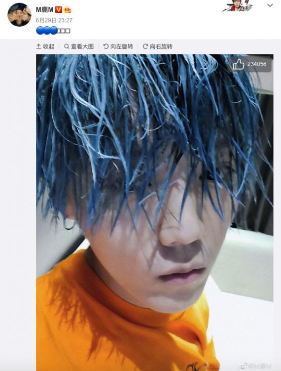 鹿晗深夜晒自拍照 身穿橙色T恤一头蓝发格外惹眼