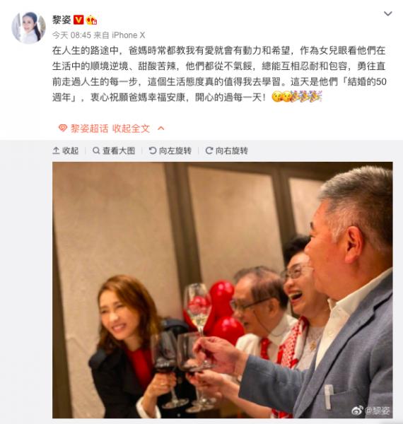 48岁黎姿为父母庆金婚 64岁老公罕见现身头发花白